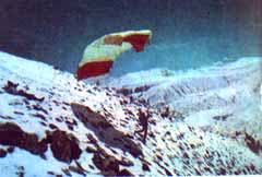 До вершины оставалось совсем немного, когда ребята увидели, что портится погода, начиналась метель. Они поняли, идти дальше бессмысленно. Сергей остановился и начал искать место для старта: надо спешить, потом будет поздно. Он выбрал подходящий склон, разложил параплан и облачился в снаряжение. Юра с альпинистами поддерживал купол. Он быстро "надулся", но когда Сергей выскочил за гребень, встречный поток погасил скорость и купол обмяк. Калабухов, обутый в "кошки", бежал по склону большими шагами, спотыкаясь и падая, но наконец-то оторвался и полетел… Он парил довольно долго, держа курс на гору Липкина, где ожидали операторы Центрального телевидения. На высоте 6000 метров сильный поток с перевала подбросил купол, чуть не сложив его пополам, и резко развернул в сторону скал. Испытатель, умело манипулируя стропами управления, вывел парашют из опасной зоны. Коварная турбулентность воздуха чувствовалась на всем пути, и, конечно, требовалось быть очень внимательным. Через одиннадцать минут он приземлился на высоте 4200 метров рядом с палатками.