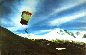 В лагере гость, естественно, был в центре внимания, отвечал на вопросы, рассказывал об испытаниях новой техники, своих замыслах. Многие загорелись желанием овладеть парашютом, чтоб потом, после восхождения на вершину, вот так, одним махом за несколько минут очутиться в базовом поселке. Полеты с гор… С чего все началось? Сейчас уже трудно установить, кому первому пришла в голову мысль попробовать улететь с вершины на планирующем парашюте - такие идеи, что называется, давно носятся в воздухе. Но, возможно, это был Николай Ушмаев, наш прославленный спортсмен, двукратный абсолютный чемпион мира. Как бы то ни было, с его легкой руки, начиная, примерно, с конца семидесятых годов, парашютисты тайно в выходные дни, под угрозой отчисления со сборов, проникали в горы, чтобы испытать радость полета под куполом на удивление чабанам или мальчишкам из близлежащего кишлака. Как сказал один из спортсменов, два момента делают эти занятия особенно привлекательными: необходимость подняться на гору пешком, чтобы получить в награду за этот тяжелый труд захватывающий полет на параплане. Удаляющаяся из-под ног земля и парение над скалами, пропастью, перевалами создает приятное ощущение собственной силы и мастерства. Еще лучше, конечно, добраться на место старта на подъемнике и взлететь, разгоняясь по склону на лыжах… Мастер спорта Сергей Калабухов совершал разные прыжки из самолета или вертолета. Он - испытатель парашютов. Услышав о полетах с гор - заинтересовался. Первые же пробы увлекли. Во время очередного отпуска облюбовал плато Сафит-Дара, что на Памире близ шахтерского поселка Такоб. Здесь расположена детско-юношеская горнолыжная школа. Есть подъемник, удобная для старта гора, высотой в полтора километра… Полеты приносили парашютистам большое удовлетворение. Испробовали свои силы и некоторые альпинисты. Но человек, преодолев одну ступень, тянется подняться выше: энтузиасты стали мечтать о полетах с пика Ленина, Коммунизма. Познакомившись с альпинистами, Сергей узнал о беспримерных восхождениях, мужестве людей, трагедиях, все еще нередко случающихся в горах, узнал не по книгам, а из первых уст. Как помочь людям, оказавшимся в беде? Известно, что малейшая простуда там, на высоте, быстро прогрессирует, превращаясь в грозную болезнь - воспаление легких, отек мозга. Нужна экстренная помощь, немедленный спуск вниз. На транспортировку обычным способом уходит много времени. А на параплане - несколько минут. Над этим и задумался Калабухов. Он увлек своей идеей других испытателей, конструкторов, однако у тех, от кого зависит решение вопроса, поддержки не получил. Однажды в институт, где работает Сергей, пришел известный альпинист, давний друг парашютистов мастер спорта СССР международного класса, кандидат технических наук Валентин Божуков. Он участвовал в комплексных научно-исследовательских экспедициях (1967 - 1968 гг.) во время совершения уникальных прыжков с парашютом на пики Ленина и Коммунизма. Теперь Валентин предложил разработать систему, на которой можно было бы спустить с гор тела погибших альпинистов. Сами спортсмены выполнить эту работу не могут: на высоте семи тысяч метров транспортировать по крутым склонам и ледникам груз весом 80 - 100 килограммов опасно и порой не под силу даже группе крепких богатырей. Невозможно это сделать и вертолетом. А 