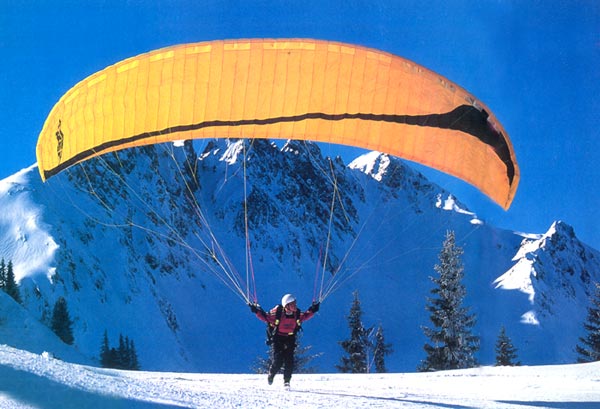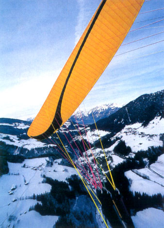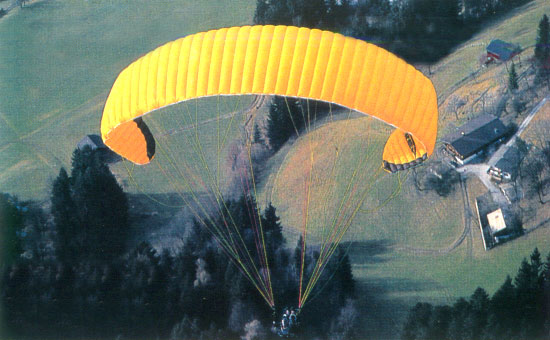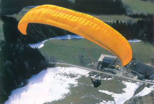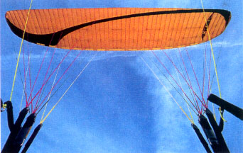 Обратный старт - никаких проблем. Приблизительно также, как у большинства современных аппаратов других фирм класса DHV 1-2. Прямой старт получается наилучшим образом, если дать крылу достаточно сильный начальный импульс, тогда купол сразу начинает выходить в полетное положение. Затем достаточно легких управляющих воздействий для того, чтобы плавно довести купол до высшей точки. Надо отметить, что при этом купол выходит медленно, что обеспечивает возможность пилоту стартовать плавно, без заскакивания купола вперед. Причиной этому можно считать довольно большой для данного класса аппаратов вес купола. До выхода в верхнеее положение клевантами следует работать минимально, поскольку это способствует сваливанию. Эта его особенность напоминает старт на более продвинутых, спортивных аппаратах. Нужно отметить, что частично закрытые секции никоим образом не влияют на наполнение и выход аппарата. |
