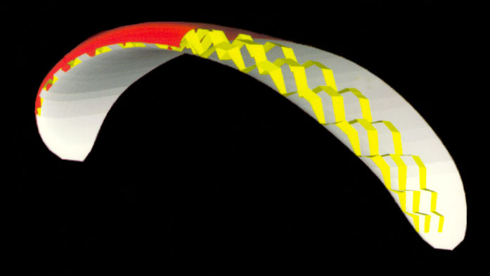 Закрытые секции? У пилотов многих поколений они ассоциируются с куполами типа Genair или Trilair фирмы Ailes & K. Несмотря на то, что каждый из конструкторов парапланов хоть раз экспериментировал с ними, все же до сих пор этот принцип не получил широкого распространения. Лишь после того, как два года назад появились спортивные купола с частично закрытыми секциями у передней кромки, о них опять заговорили. Так что же это, дань моде или прорыв вперед? В настоящее время едва ли какая фирма откажется от этого новшества в конструкции спортивных парапланов. Представив Rebel, Airea стала первой в мире фирмой, применившей частично закрытые секции в аппарате класса DHV 1-2. Airea называет эту систему "ССТ" (Closed Cell-Technology, технология закрытых ячеек), или проще - каждая третья секция Rebel закрыта и надувается только изнутри. Согласно концепции Airea, закрытые секции значительно уменьшают интерференционное сопротивление и, прежде всего, снижают деформацию передней кромки при полете на максимальной скорости.