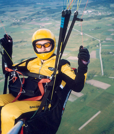 Сначала был авиамодельный кружок в ДОСААФ, затем, лет так в четырнадцать, секция планеризма. Прыжки с парашютом тоже не очень мне понравились, так как очень хотелось задержаться в воздухе подольше, поэтому в 1996 году начал пробовать параплан. Мне очень помогло знакомство с Олегом Кушлевичем, который много чего рассказал и объяснил. А потом понеслось: горки, лебедки, Юца, Домбай, Де-пилс... |