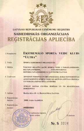 Клуб энтузиастов получил официальный статус общественной организации! 6 апреля 2000 года клуб “ULTRA” включен в регистр предприятий Латвии, как Клуб Экстремальных Видов Спорта “ULTRA” под номером 000805001. C тех пор, 6 апреля принято считать официальным днем рождения клуба. Будем очень рады подаркам! =)